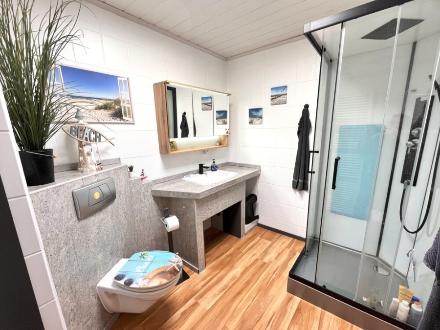 Im Erdgeschoss werden Sie in einem schönen Flur empfangen, von hier kommen Sie in alle Räume des bunten Familientreibens: Ins Wohnzimmer mit seinem urigem Kamin - in das schicke Bad mit Dusche und in die große Küche mit Essbereich. Von hier geht es auch nach draußen auf die überdachte Terrasse und den gemütlichen Garten.