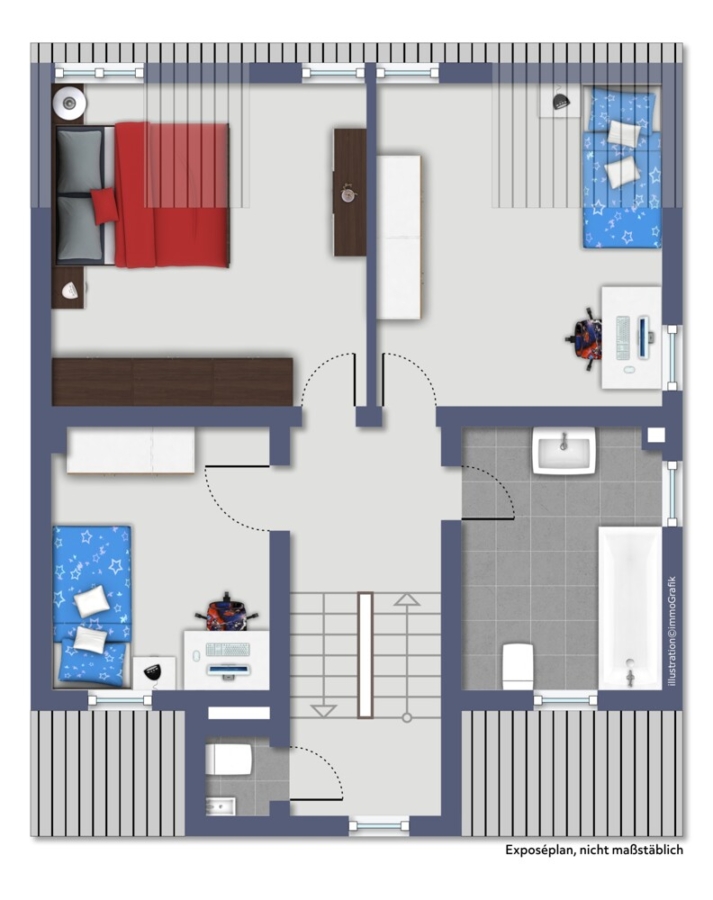 Im Obergeschoss erwarten Sie drei weitere Zimmer und ein großes Tageslichtbad mit Badewanne und Dusche.