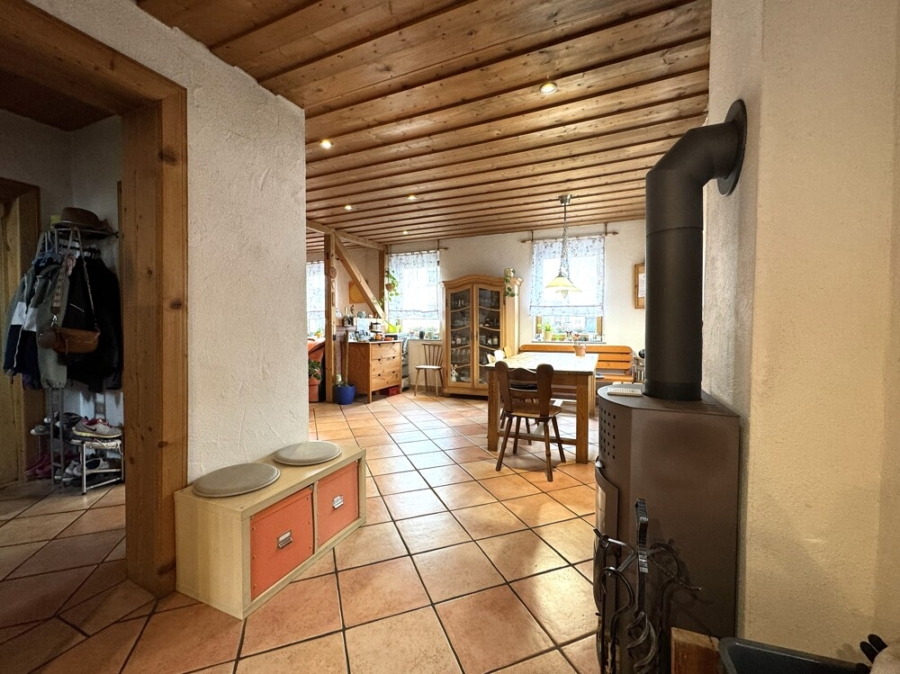 Erdgeschoss: Ein Wohnzimmer, der Essbereich mit Kaminofen, ein weiteres Zimmer, eine offene Küche, ein Gäste-WC und der Zugang auf die Terrasse.