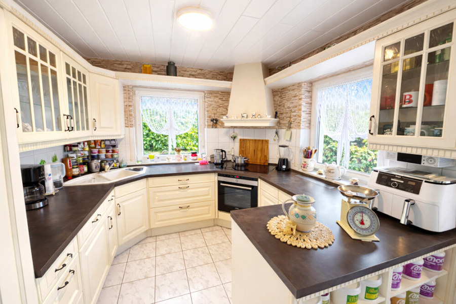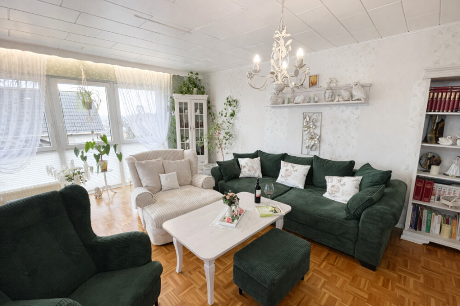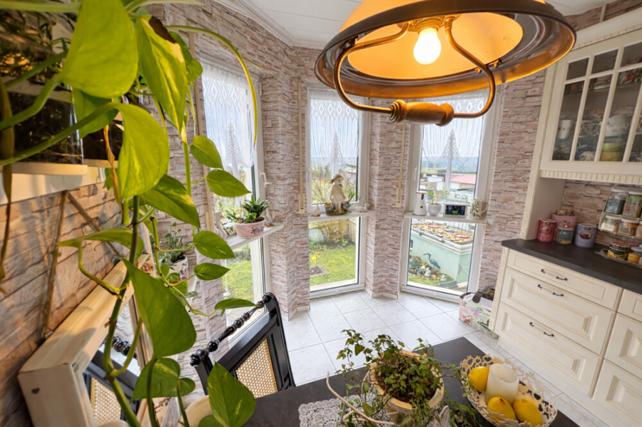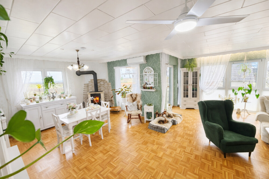 Schon beim Eintreten fällt auf, wie hell und freundlich die Räume wirken. Große Fensterfronten holen die Landschaft quasi direkt ins Wohnzimmer. Das architektonische Highlight ist zweifellos der Erker mit seinen bodentiefen Fenstern. Nehmen Sie sich ein Glas Wein, genießen Sie den Ausblick und die Zeit bleibt für den Moment stehen.