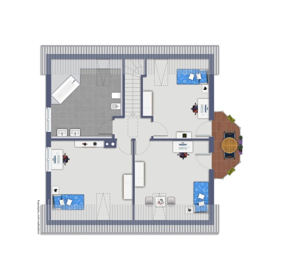 Im Erdgeschoß haben die Eltern ihr Schlafzimmer und das Duschbad. Die Kinder freuen sich über die drei wirklich großen Zimmer oben. Hier oben gleicht das Tageslicht-Badezimmer eher einem Wellness-Tempel.