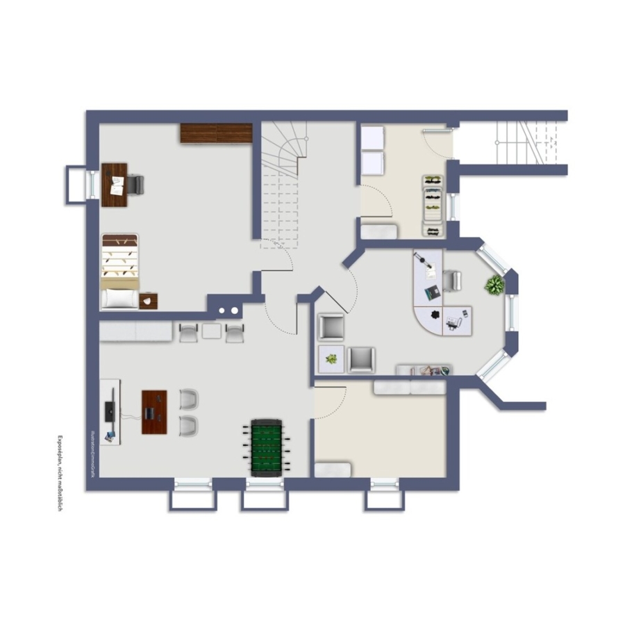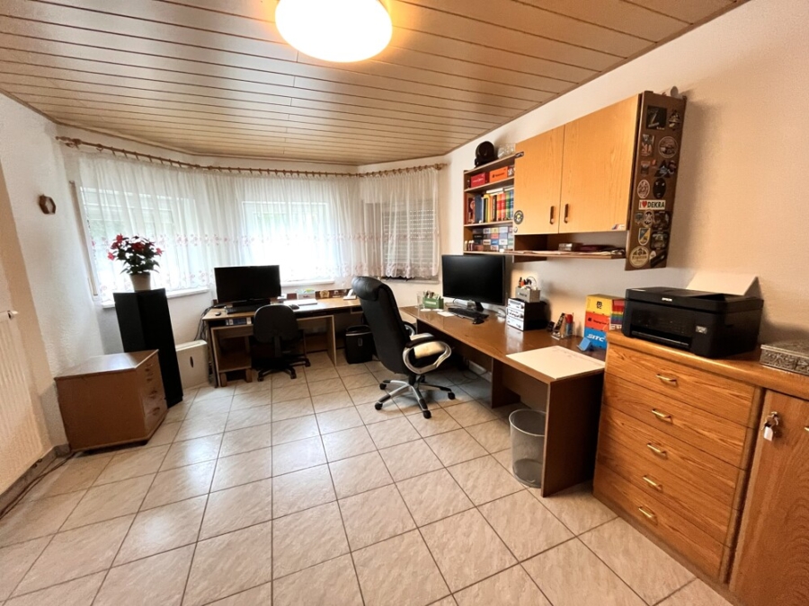 Im Untergeschoß sind die Nutz- und Hobbyräume untergebracht. Das Arbeitszimmer hat große Fenster zum Garten, und durch die angenehme Deckenhöhe kann hier auch ein Gäste-Zimmer entstehen.