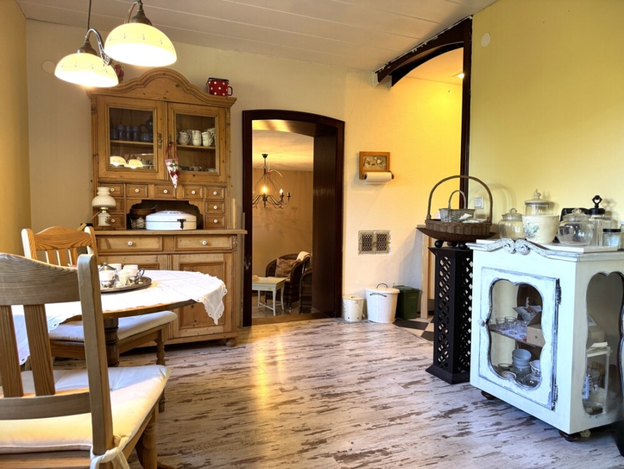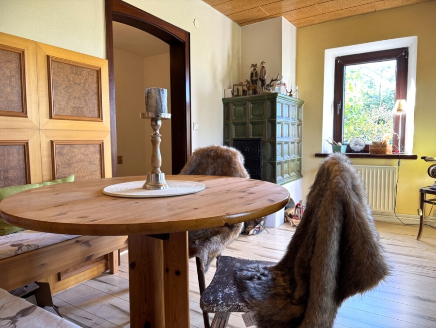 In diesem Haus finden Sie im Erdgeschoss ein modernisiertes Badezimmer mit Dusche. Das Esszimmer mit urigem Kachelofen lädt geradezu ein um hier gemütliche Abende mit Freunden und der Familie zu verbringen. Daneben befindet sich noch ein ein kleines Büro für Sie. Neben der Küche haben wir noch einen weiteren Raum sowie das Wohnzimmer das auch über einen wunderschönen Kachelofen verfügt. Der Ruhe und Gemütlichkeit werden hier keine Grenzen gesetzt.