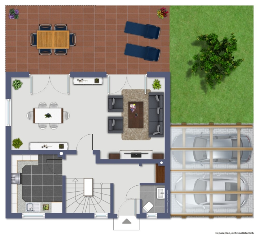 Auch an unsere Mobilität ist gedacht: Mit drei PKW-Stellplätzen und einem Carport gibt es genügend Platz für unsere Autos – und vielleicht sogar für Besuch.