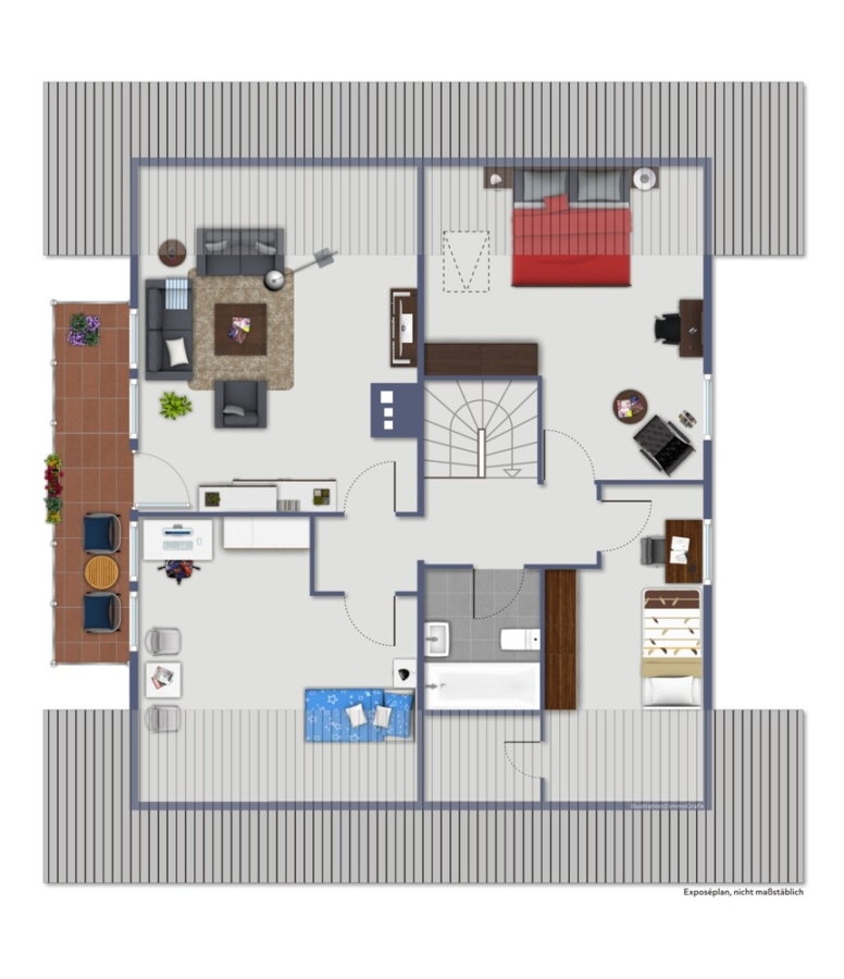 Dachgeschoss: Vier Zimmer, ein Tageslichtbad mit Badewanne und Zugang auf den Balkon.