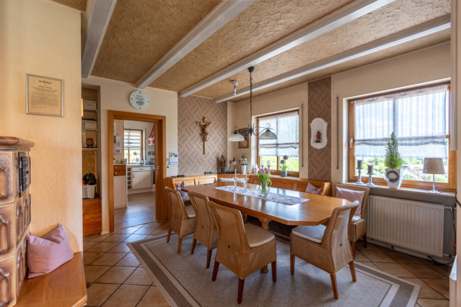 Das Wohnzimmer bietet einen einladenden Rückzugsort, in dem Gemütlichkeit und Atmosphäre verschmelzen. Ein Kaminofen sorgt für Wärme und verleiht eine behagliche Note. Der Essbereich, nahtlos integriert, schafft ein einladendes Flair für gesellige Mahlzeiten und verspricht ein harmonisches Zusammenspiel von Kochen und Genießen.