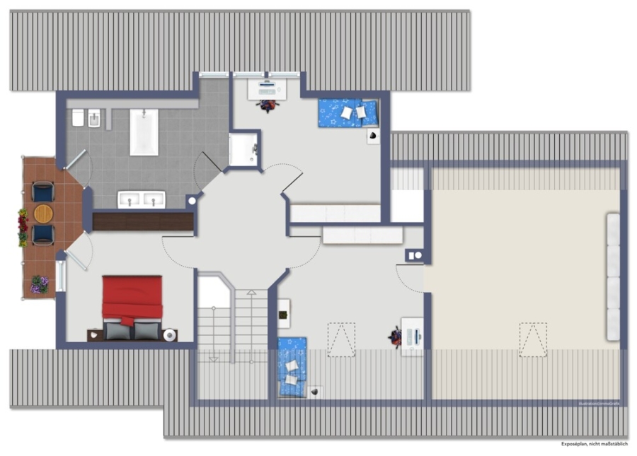 Dachgeschoss: Treppenaufgang mit Diele, drei Zimmer und zwei zusätzliche Zimmer, die wohnlich ausgebaut sind, Bad mit Dusche und Badewanne, Balkonzugang, Ankleidezimmer