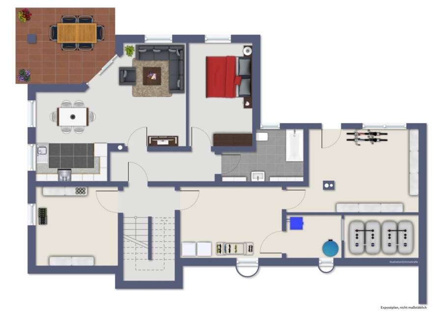 Das Untergeschoss bietet eine große Einliegerwohnung zum Wohnen, Kochen, Schlafen, Bad, Diele und die Terrasse.