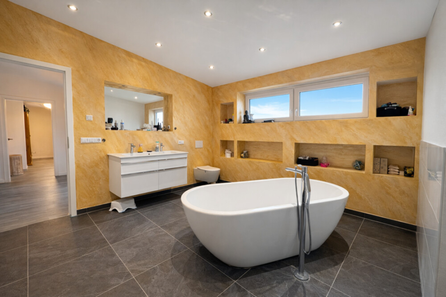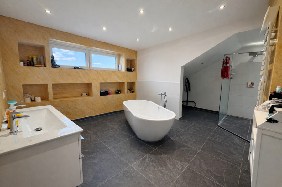Im Dachgeschoss stehen ein komfortables Elternschlafzimmer sowie zwei Kinderzimmer zur Verfügung. Das großzügige und stilvoll gestaltete Badezimmer überzeugt mit einer freistehenden Badewanne und einer bodengleichen Dusche.