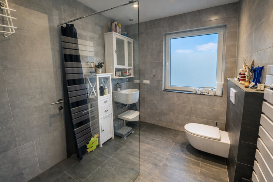 Der wohnlich ausgebaute Kellerbereich eröffnet zusätzliche und vielseitig nutzbare Räume. Neben dem Arbeitszimmer und einem Abstellzimmer finden sich hier eine Werkstatt sowie ein vorbereiteter Saunabereich mit begehbarer Dusche. Ein separates Gäste-WC sowie der Heizungsraum mit Waschküche runden diese Ebene funktional ab.