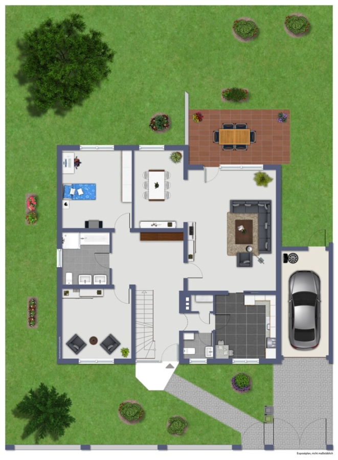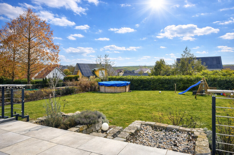 Eine großzügige Terrasse führt in den weitläufigen Garten, der Raum für Freiheit und Erholung schenkt.