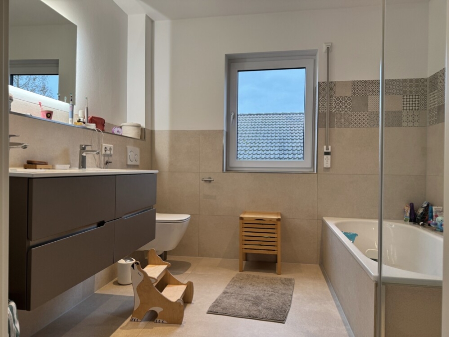 Zwei stilvolle Badezimmer sowie ein separates Gäste-WC sorgen für Wohnqualität im Alltag. Funktionale Nebenräume – Abstellräume, Waschraum und Heizungsraum – schaffen Ordnung und Struktur.