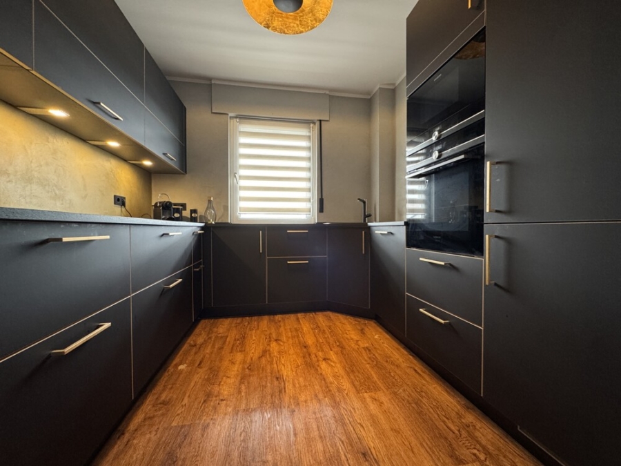 - Moderne Einbauküche mit Cerankochfeld bzw. Kochfeld, Backofen, Geschirrspüler, Dunstabzugshaube, Kühlschrank und einem großzügigen Fenster