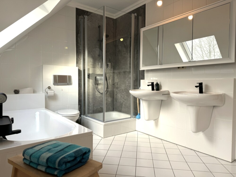 Gleich zwei Balkone schenken Raum für kleine Auszeiten – ein Morgenkaffee in der Sonne, ein ruhiger Abendblick über die Nachbarschaft. Und die Terrasse wird schnell zum Herzen des Hauses: ein Ort für Grillabende, Kinderlachen und laue Sommernächte. Das Gästebad mit Dusche im Erdgeschoss gibt zusätzlichen Komfort.