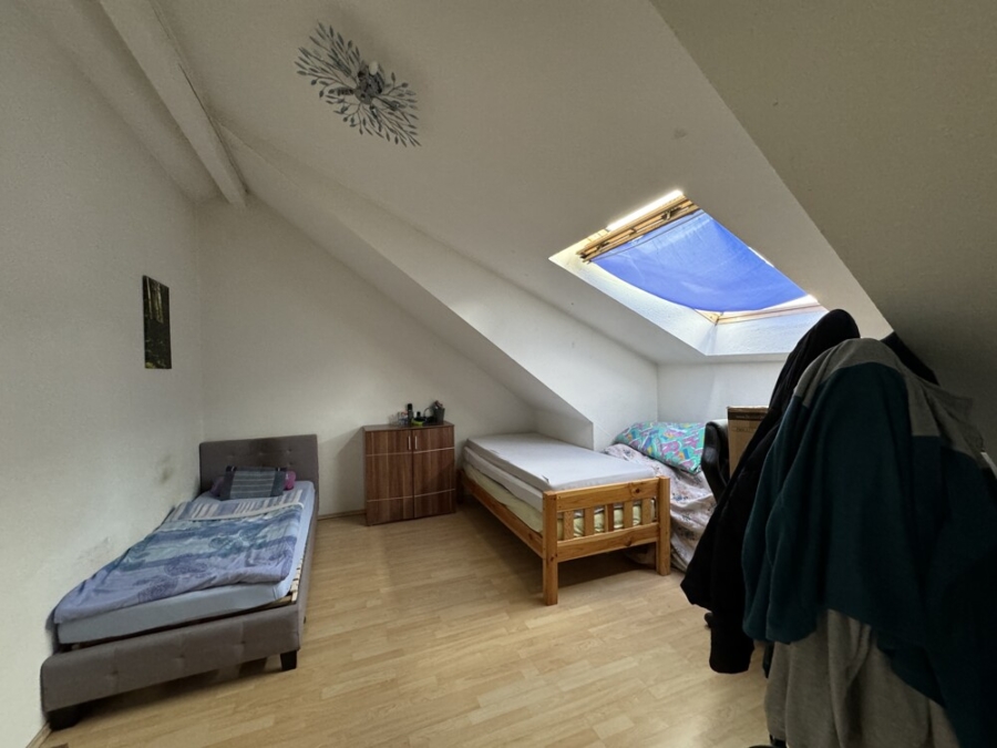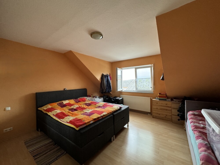 Die Wohnung bietet ein Elternschlafzimmer im Dachgeschoss sowie zwei Kinderzimmer im ausgebauten Spitzboden, die jedem Familienmitglied einen eigenen Rückzugsort ermöglichen.