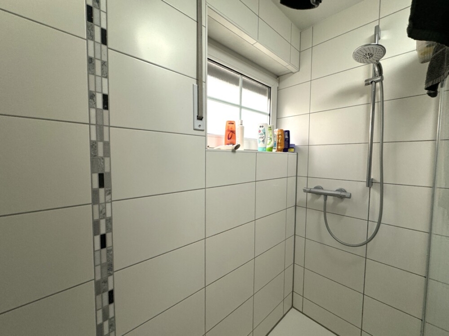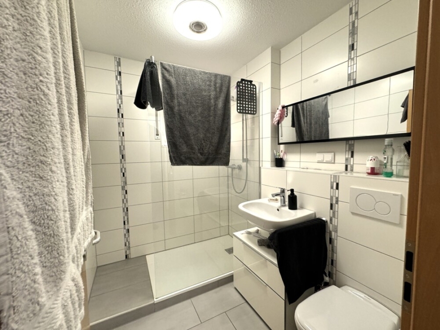 Die Wohnung überzeugt mit einem neu gestalteten Bad, in dem moderne Materialien und klare Linien eine angenehme, frische Atmosphäre schaffen.