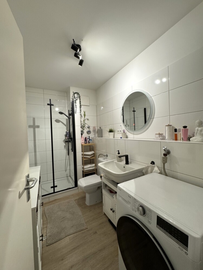 Die Wohnräume sind mit Laminatböden ausgestattet, die für ein freundliches und zeitgemäßes Wohngefühl sorgen. Das Badezimmer präsentiert sich sauber, modern und funktional mit einer Dusche.