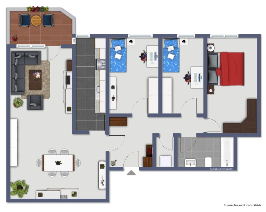 Neben der stilvollen Küche und dem modernen Badezimmer, ermöglichen drei gut geschnittene Schlafzimmer eine flexible Nutzung.
