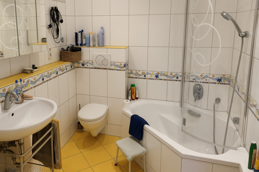 Das Badezimmer ist praktisch geschnitten und verfügt über Badewanne, Waschbecken und WC.
