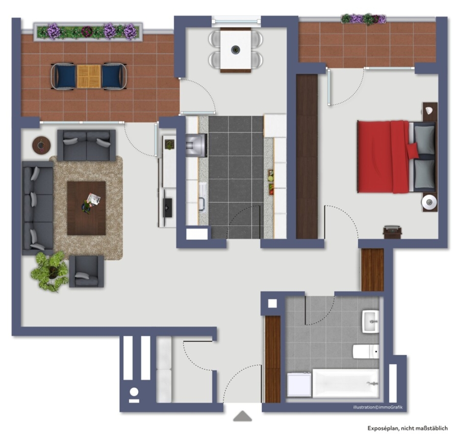 Die Wohnung beeindruckt durch ihren klaren Zuschnitt: Das Herzstück der Wohnung ist das großzügige Wohnzimmer, das zusammen mit der angrenzenden hellen Wohnküche Zugang zum sonnigen Balkon bietet – ideal für entspannte Stunden im Freien. Die helle, moderne Einbauküche mit viel Stellfläche lädt dabei zum gemeinsamen Kochen und Genießen ein.