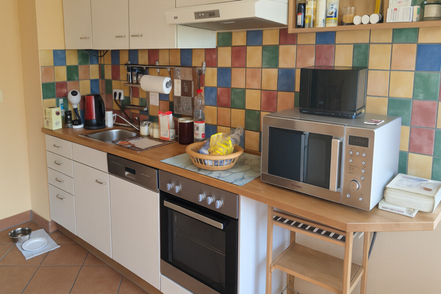Das großzügige Wohnzimmer bildet das Herzstück der Wohnung und verfügt, ebenso wie die Wohnküche, über einen Zugang zu einem der beiden Balkone. Die Küche ist hell, mit einer Einbauküche ausgestattet und bietet Platz für einen Esstisch.